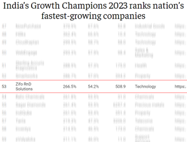 We are extremely pleased to announce that we have been listed as one of the companies in The Economic Times & Statista’s India’s Growth Champions 2023. Zifo ranks 53 in the top 125 companies that have achieved the highest growth between 2019 and 2022.